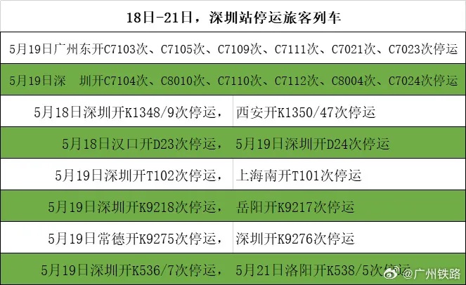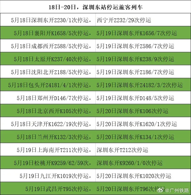 5月19日筹算停运京广线普速列车56列、京九线普速列车13列、广深线城际列车12列。