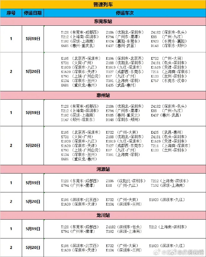 东莞东、惠州、河源、龙川站部分停运车次如下